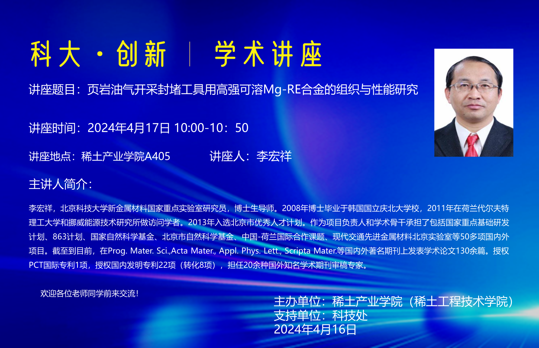 讲座题目:页岩油气开采封堵工具用高强可溶Mg-RE合金的组织与性能研究