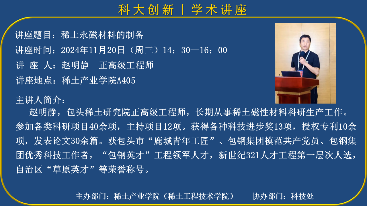 赵明静,包头稀土研究院正高级工程师,长期从事稀土磁性材料科研生产工作。参加各类科研项目40余项,主持项目12项。获得各种科技进步奖13项,授权专利10余项,发表论文30余篇。获包头市“鹿城青年工匠”、包钢集团模范共产党员、包钢集团优秀科技工作者,“包钢英才”工程领军人才,新世纪321人才工程第一层次人选,自治区“草原英才”等荣誉称号。